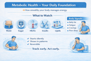 Assessing Our Metabolic Health! What is metabolic health? Metabolic health is how efficiently your body: Uses and stores energy Maintains stable blood sugar Regulates insulin, blood pressure, and lipids In simple terms: It’s how smoothly your body runs its ‘energy system.’ *** You can feel ‘normal’ and still have underlying metabolic strain—because early changes are […]