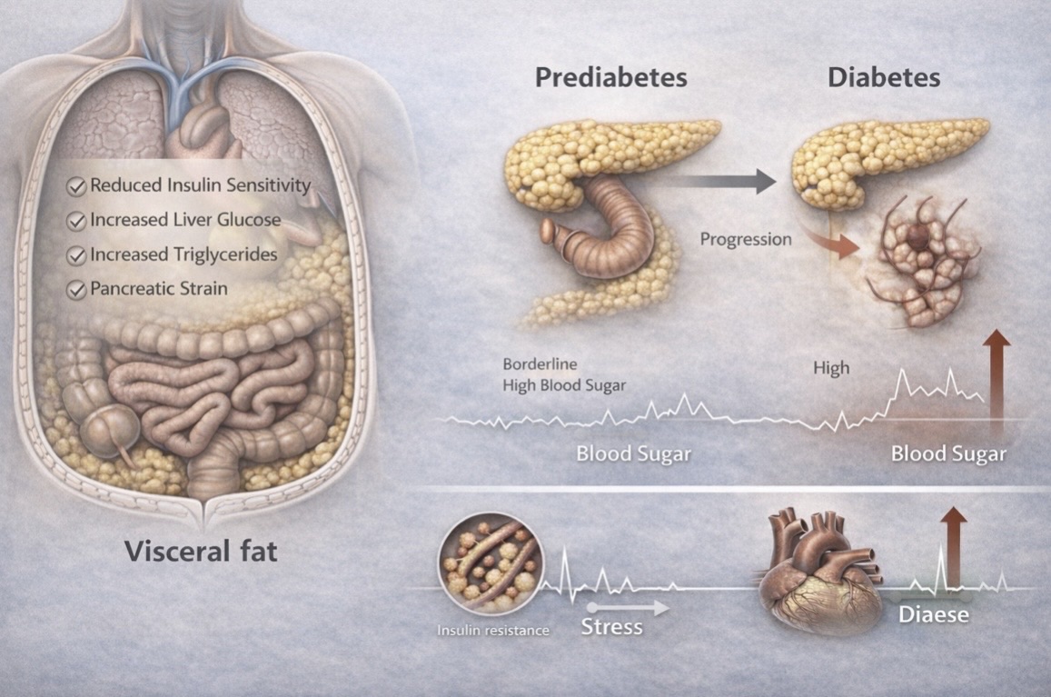 If visceral fat continues to accumulate, compensation fails — and pre diabetes progresses to type 2 diabetes.